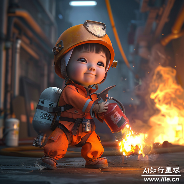 这幅画展现了一个可爱的婴儿角色扮演消防员的场景,通过将天真无邪的幼儿与英勇的职业形象相结合,创造出一种既幽默又令人印象深刻的视觉效果。设计巧妙地利用对比来强调消防安全意识的重要性,同时也呈现了孩子们无尽的好奇心和探索精神。整体风格明快、色彩鲜艳,背景中的火焰和工业环境为这个逗趣的画面增添了紧张感和戏剧性。