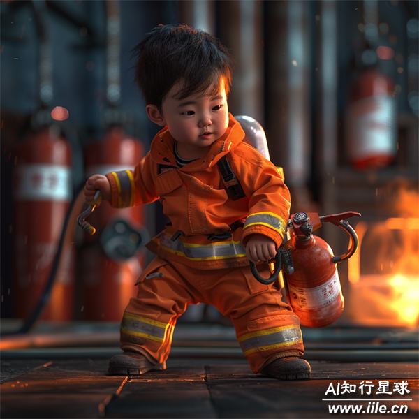 这幅画展现了一个可爱的婴儿角色扮演消防员的场景,通过将天真无邪的幼儿与英勇的职业形象相结合,创造出一种既幽默又令人印象深刻的视觉效果。设计巧妙地利用对比来强调消防安全意识的重要性,同时也呈现了孩子们无尽的好奇心和探索精神。整体风格明快、色彩鲜艳,背景中的火焰和工业环境为这个逗趣的画面增添了紧张感和戏剧性。