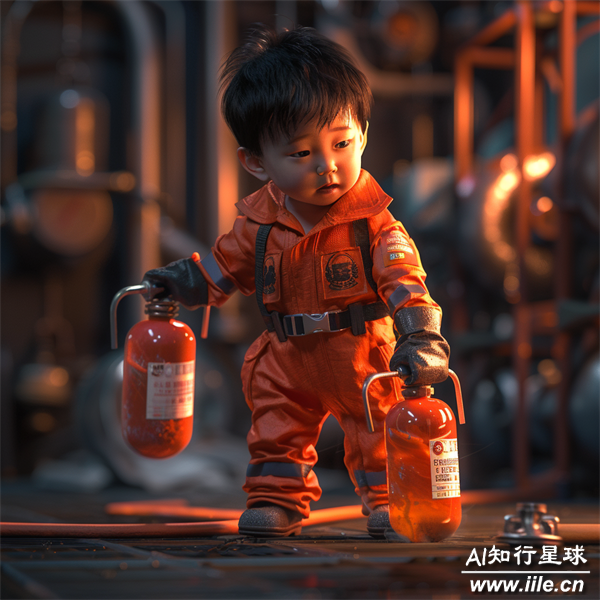 这幅画展现了一个可爱的婴儿角色扮演消防员的场景,通过将天真无邪的幼儿与英勇的职业形象相结合,创造出一种既幽默又令人印象深刻的视觉效果。设计巧妙地利用对比来强调消防安全意识的重要性,同时也呈现了孩子们无尽的好奇心和探索精神。整体风格明快、色彩鲜艳,背景中的火焰和工业环境为这个逗趣的画面增添了紧张感和戏剧性。