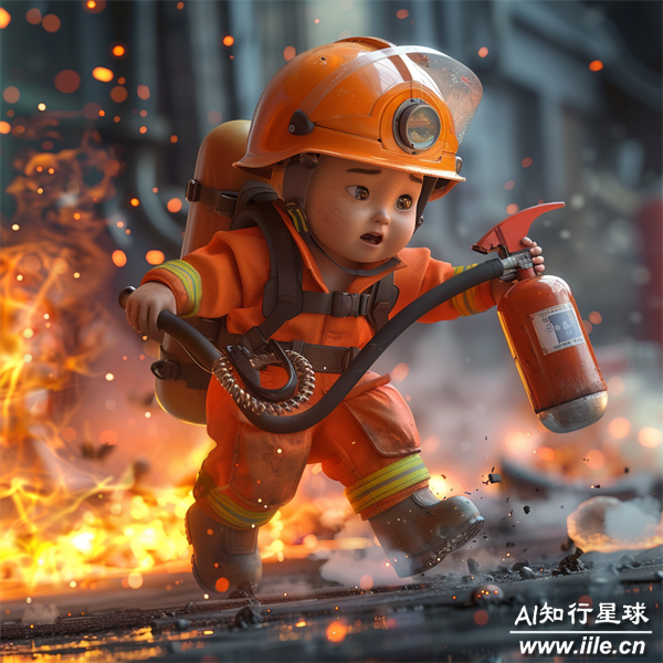 这幅画展现了一个可爱的婴儿角色扮演消防员的场景,通过将天真无邪的幼儿与英勇的职业形象相结合,创造出一种既幽默又令人印象深刻的视觉效果。设计巧妙地利用对比来强调消防安全意识的重要性,同时也呈现了孩子们无尽的好奇心和探索精神。整体风格明快、色彩鲜艳,背景中的火焰和工业环境为这个逗趣的画面增添了紧张感和戏剧性。